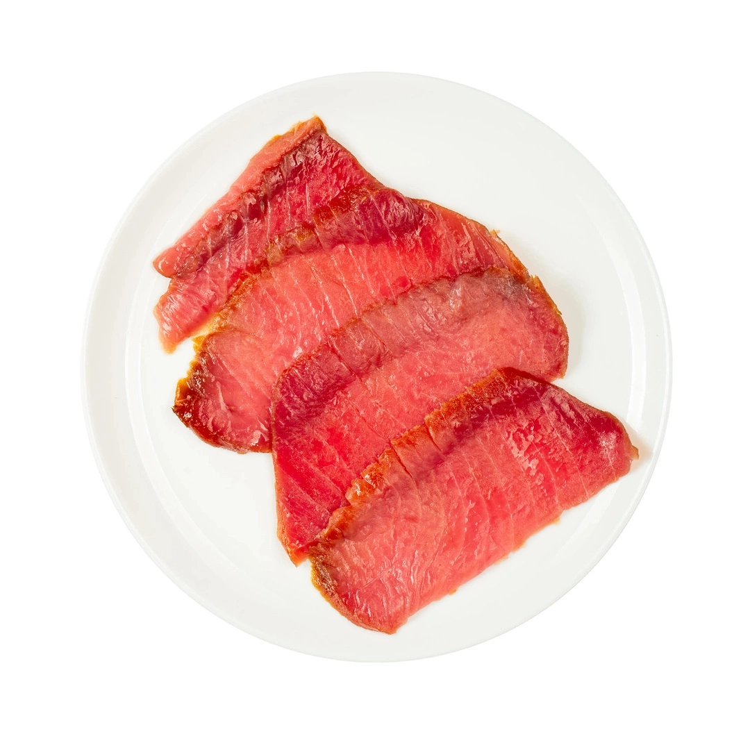 Тунец Рыбное дело холодного копчения — идеальный выбор для ценителей морепродуктов. Ломтики отличаются нежным вкусом и ароматом. Продукт прекрасно подходит для приготовления закусок, салатов и суши.