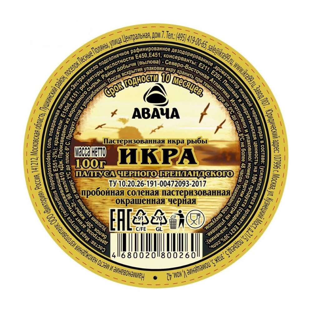 Икра палтуса черного гренландского, соль, масло подсолнечное рафинированное дезодорированное, ароматизатор пищевой (декстроза, усилитель вкуса и аромата Е621, мальтодекстрин, ароматизатор), краситель пищевой (красители Е150d, Е151, Е172, вода), регулятор кислотности Е330, консерванты Е211, Е202. Продукция производится на предприятии, где используются горчица, злаки, содержащие глютен, моллюски, ракообразные, молоко (лактоза), яйца.